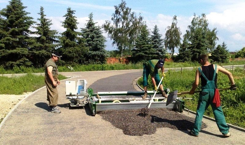 Укладывать резиновое наливное покрытие возможно в сухую погоду на сухое основание. Лучшим температурным диапазоном для работы являются границы от + 18 до +22. В такую погоду текучесть клея оптимальная и работа с пластичным материалом положительно сказывается на результате. В диапазоне температуры +5+10 укладка покрытия проходит сложней из-за большой плотности клея. При температуре +25 и выше, связующее в бочках необходимо убирать в тень от солнечного света. Высокие температуры увеличивают текучесть клея и в уложенном покрытии от перегрева связующее не успев закрепится опускается вниз, оставляя верхние гранулы покрытия без расчётного количества связующего.